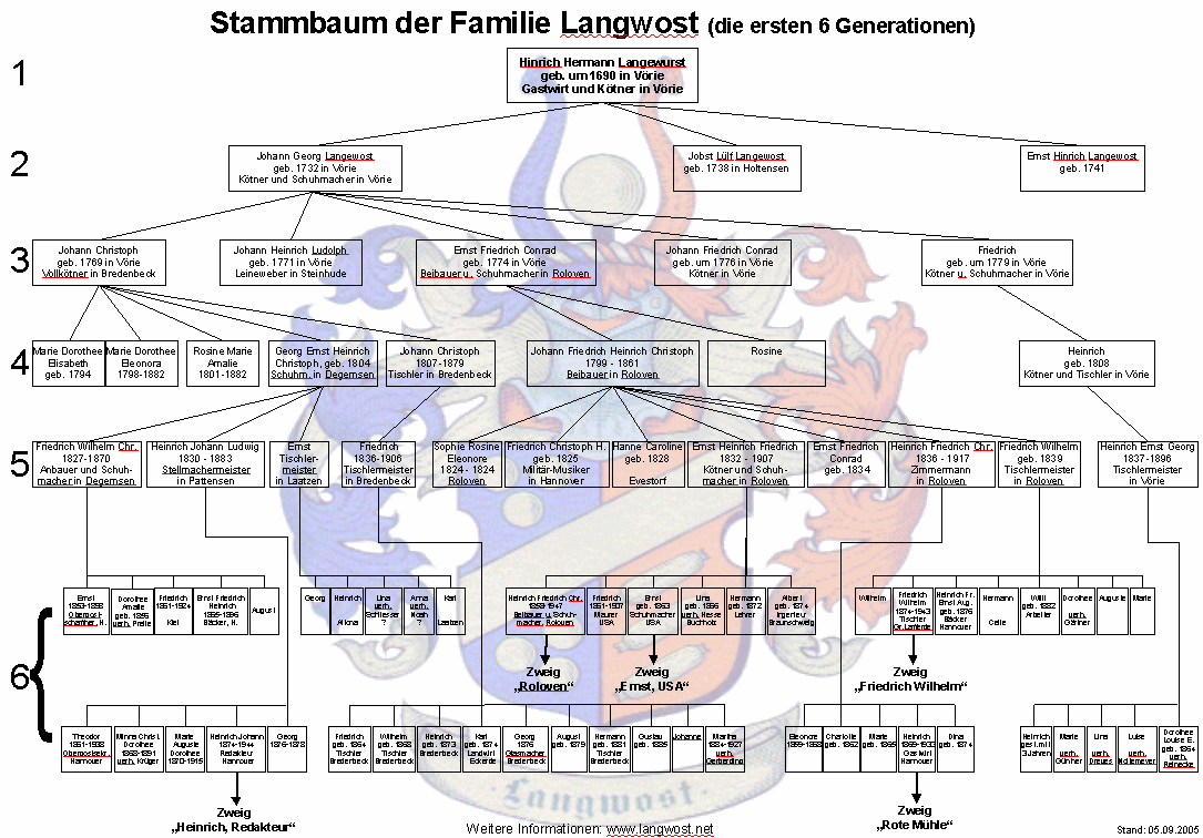 Der Langwost-Stammbaum umfasst zur Zeit 11 Generationen mit über 500 Personen. Wir sind immer noch dabei, den Stammbaum zu erstellen. |